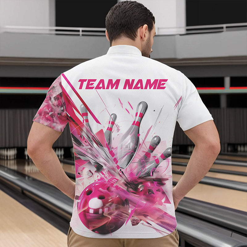 Custom White And Pink Custom Bowling Quarter-Zip Shirts For Men, Bowling Tournament Team Shirt IPHW8460