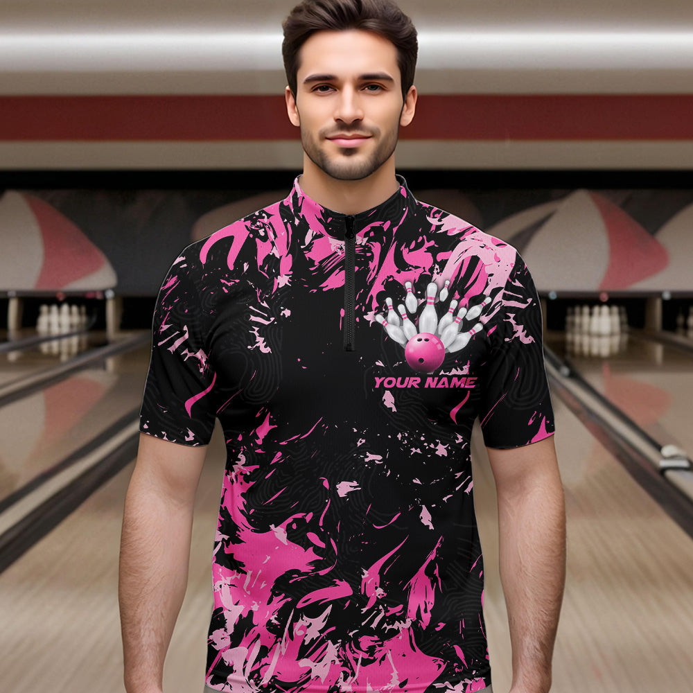 Black And Pink Custom Bowling Team Men Quarter-Zip Shirts, Bowling Ball And Pin Bowling Jerseys IPHW8798