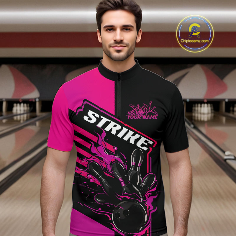 Custom Black And Pink Flame Strike Bowling Quarter-Zip Shirts For Men, Fire Bowling League Shirt IPHW9269