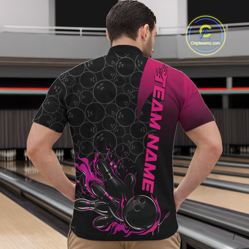 Custom Bowling Pattern Pink Flame Strike Bowling Team Men Quarter-Zip Shirts, Bowling Jerseys IPHW9417