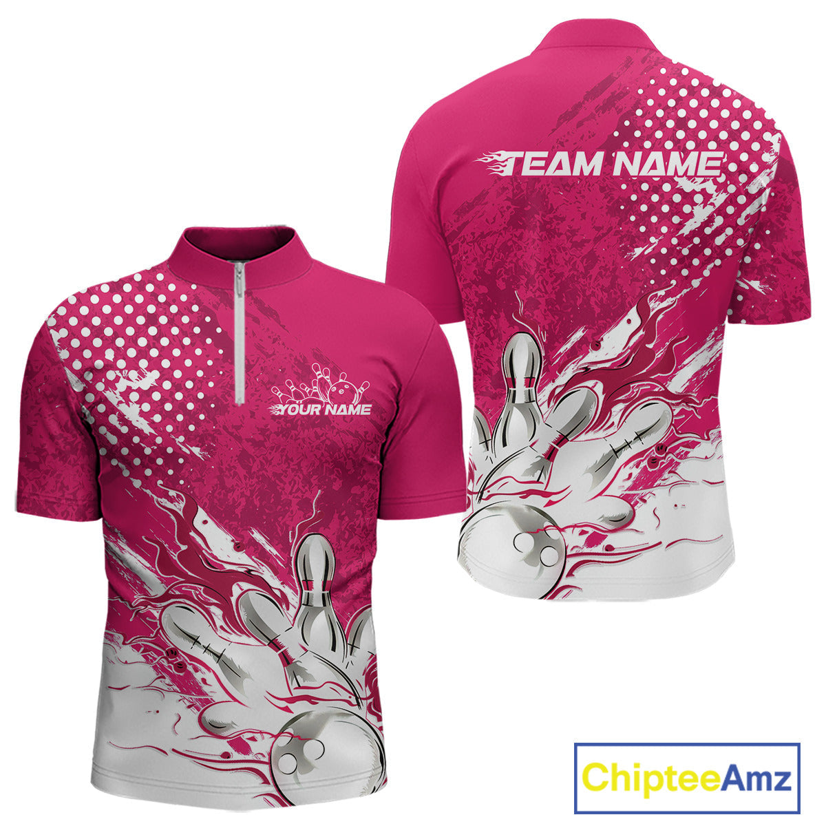 Custom White And Pink Bowling Team Quarter-Zip Shirts For Men, Flame Bowling Jerseys Team Shirt IPHW9619