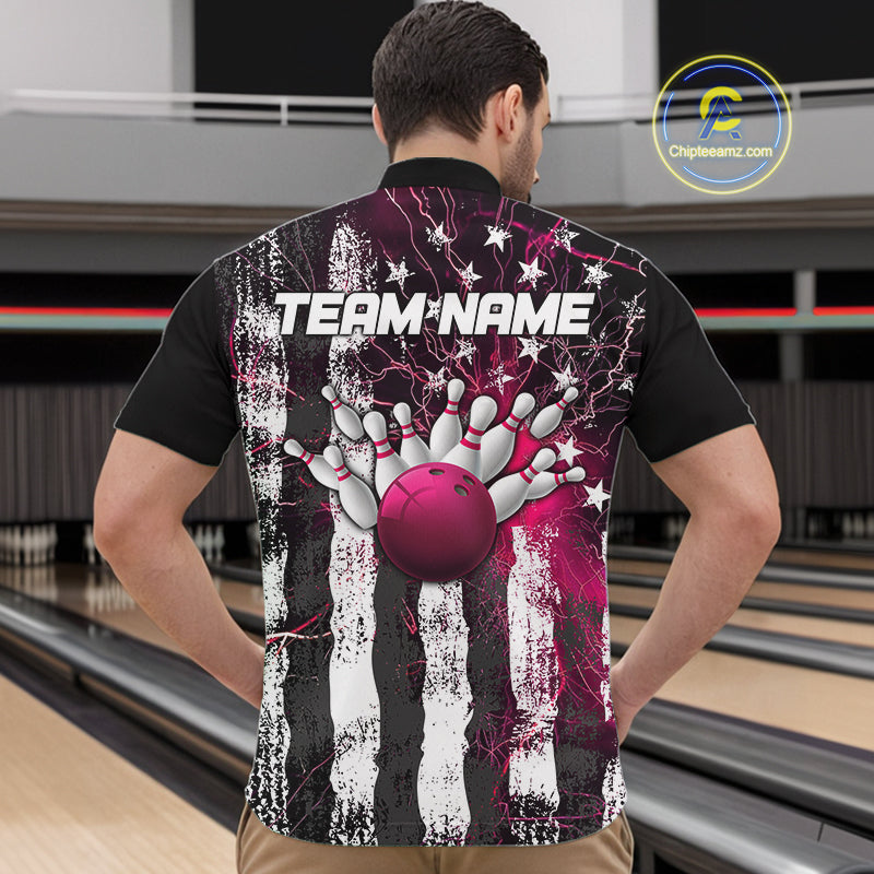 Pink Lightning US Flag Custom Bowling Team Jerseys, Patriotic Bowling Quarter-Zip Shirt For Men IPHW9916