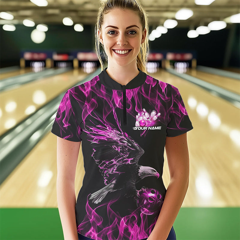 Custom Black And Pink Flame Eagle Bowling Women Quarter-Zip Shirts, Bowling League Shirt IPHW8800