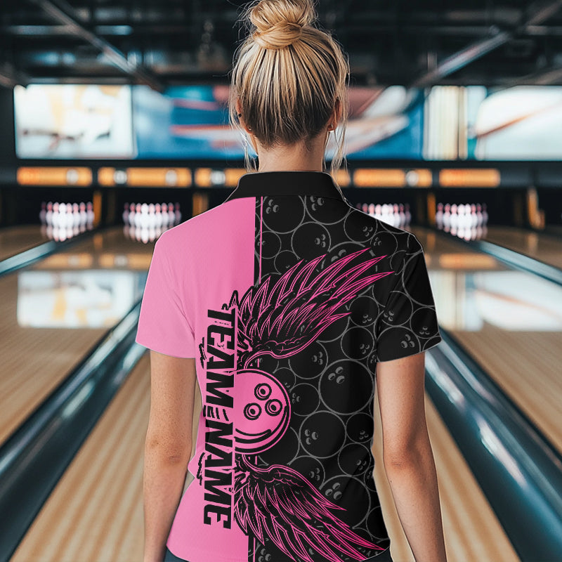 Black And Pink Custom Bowling Tournament Women Quarter-Zip Shirts, Bowling Ball And Wings IPHW8848