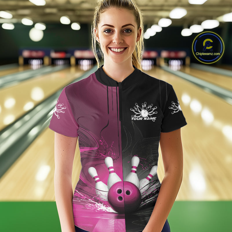 Half Black Half Pink Custom Bowling Women Quarter-Zip Shirt, Bowling Tournament Shirt IPHW9447