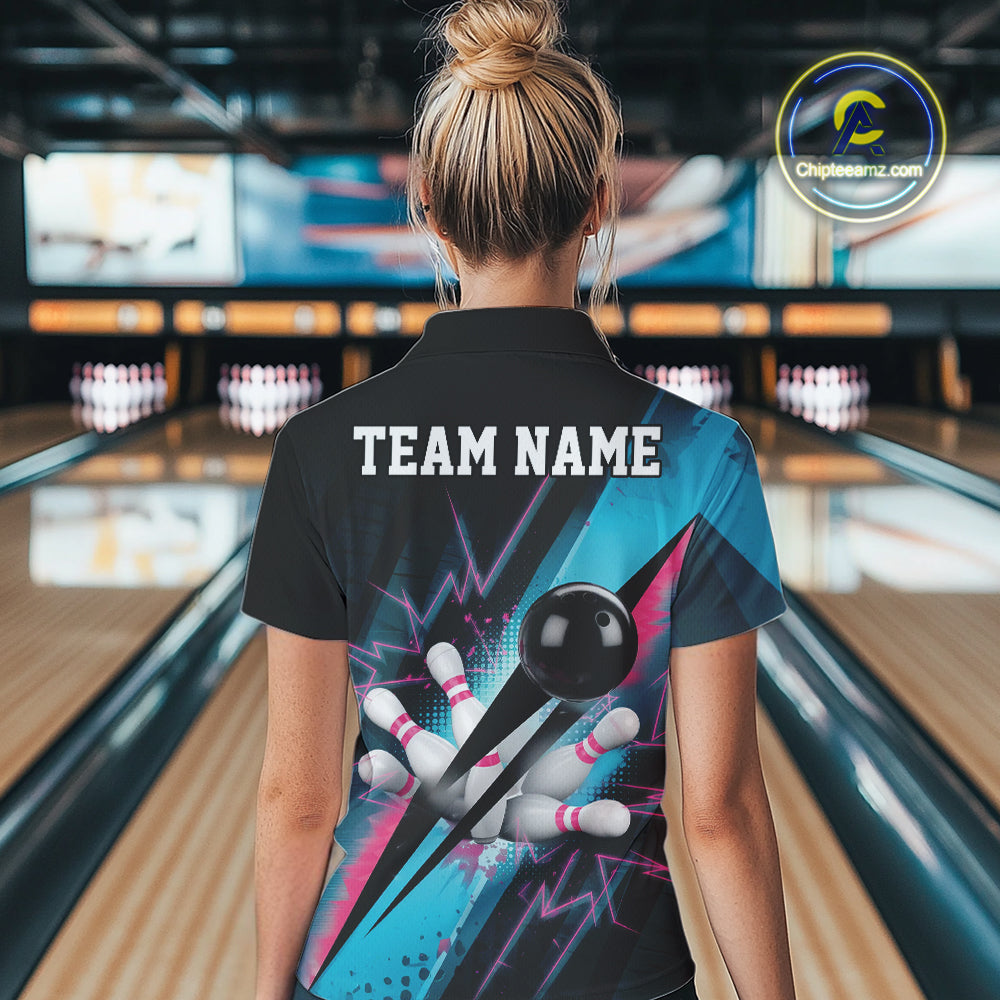 Custom Blue Pink Synthwave Style Bowling Women Quarter-Zip Shirt, Bowling League Shirt IPHW9514