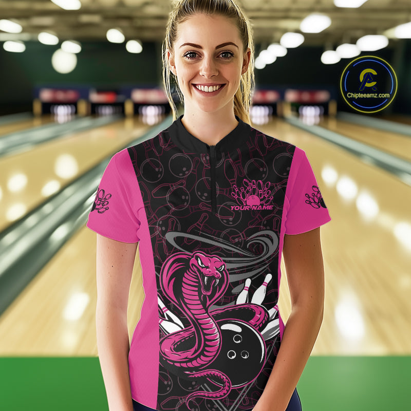 Custom Pink Cobra Snake Bowling Team Women Quarter-Zip Shirts, Bowling Pattern Shirt IPHW9707