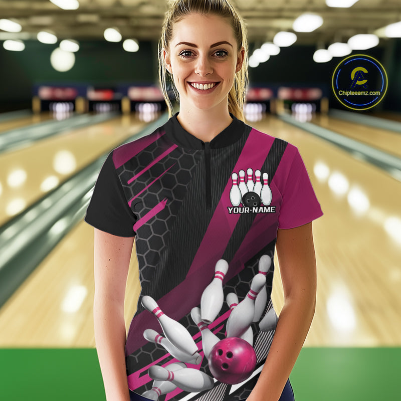 Custom Pink Bowling Team Jerseys, Striking Bowling League Quarter-Zip Shirt For Women IPHW9810
