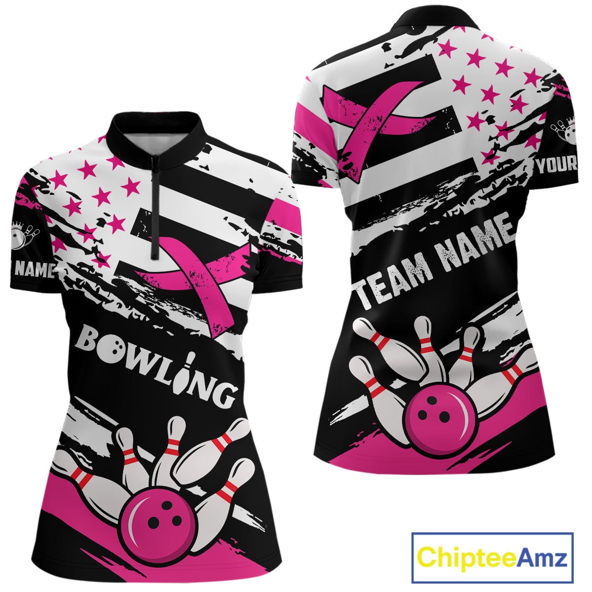 Breast Cancer Awareness American Flag Bowling Shirt For Women Custom Pink Ribbon Bowling Team Jersey TDM4655