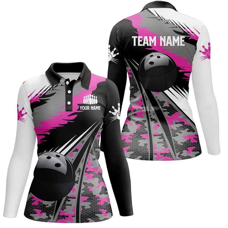 Womens bowling polo shirts Custom black ball pink camo Bowling Team Jersey, gift for girl Bowlers NQS5424