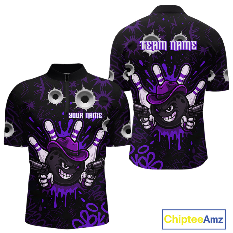 Funny Black and Purple Bowling Cowboy gun Men bowling polo, 1/4 zip shirts Custom bowling team jersey NQS10659