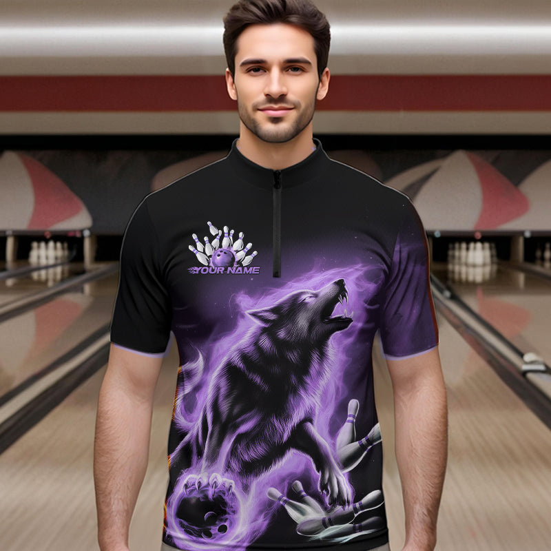 Custom Purple Fire Flaming Wolf Bowling Quarter-Zip Shirts For Men, Wolf Bowling Tournament Shirt IPHW8428