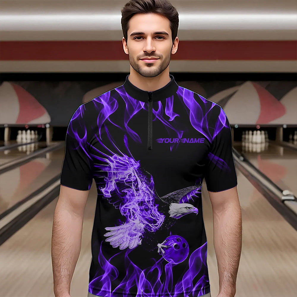Custom Black And Purple Flame Eagle Bowling Team Men Quarter-Zip Shirts, Eagle Bowling League Shirt IPHW8790