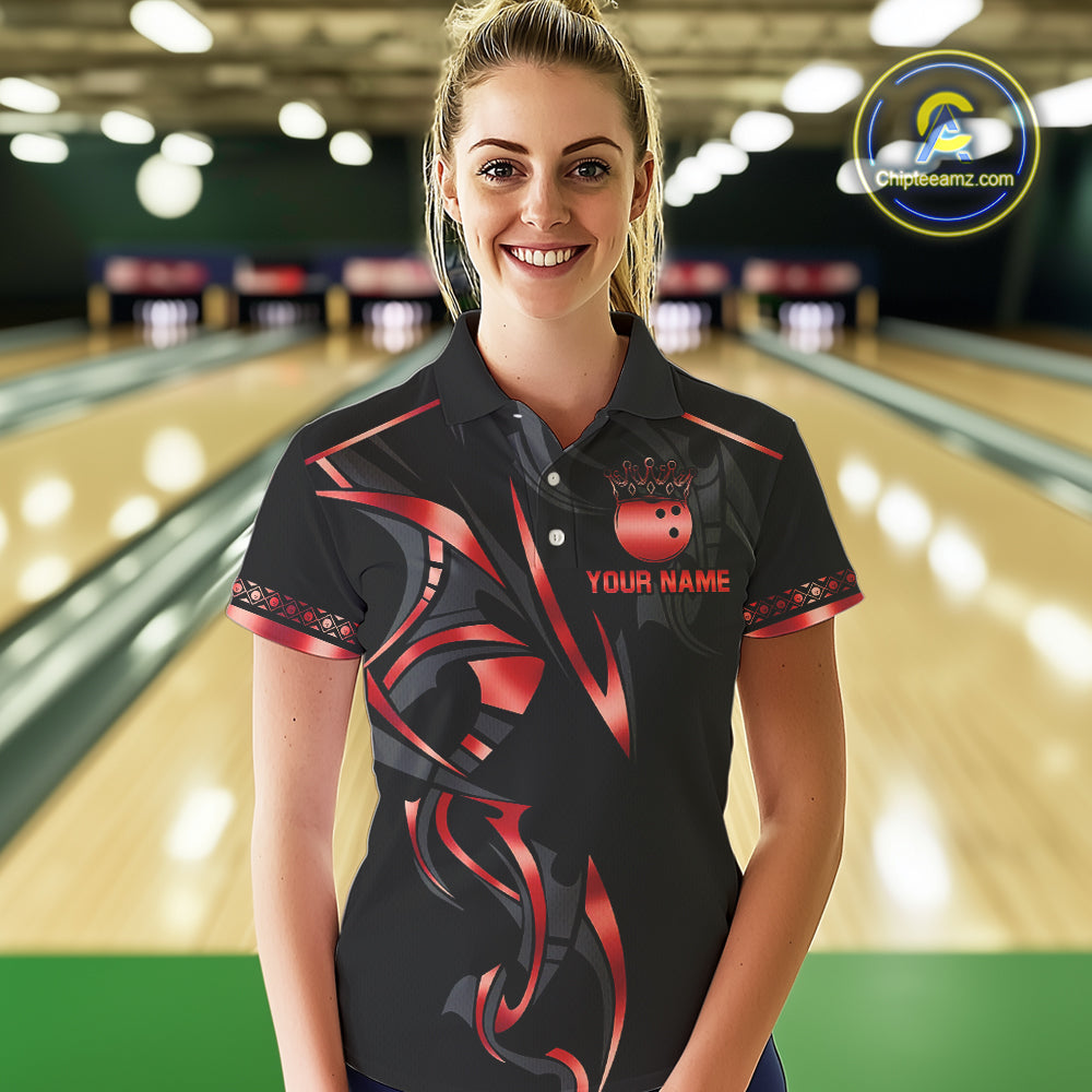 Black and Red crown Bowling ball Polo, Quarter Zip Shirts for Women Custom Bowling Team jerseys NQS10047