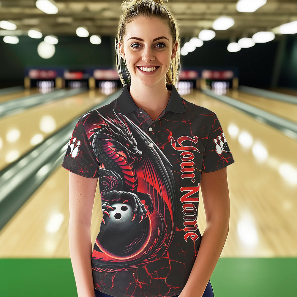 Black And Red Custom Dragon Bowling Shirts For Women, Dragon Bowling Team Shirts NQS9478