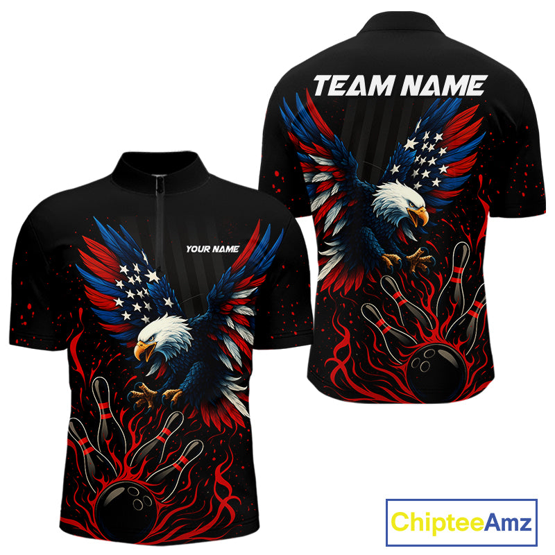 Black and Red Flame American Flag Eagle Bowling Shirts For Men Custom Patriotic Bowling Team Jersey NQS10878