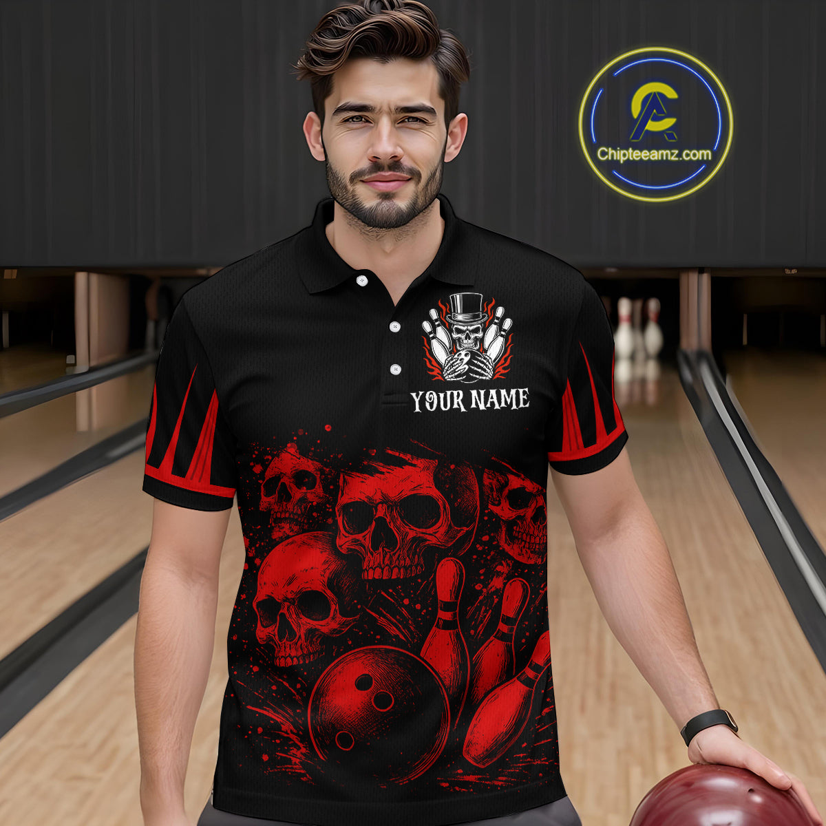 Black and Red Flame Skull Bowling Polo, Quarter Zip Shirts For Men Custom Skull Bowling Team Jerseys NQS9985
