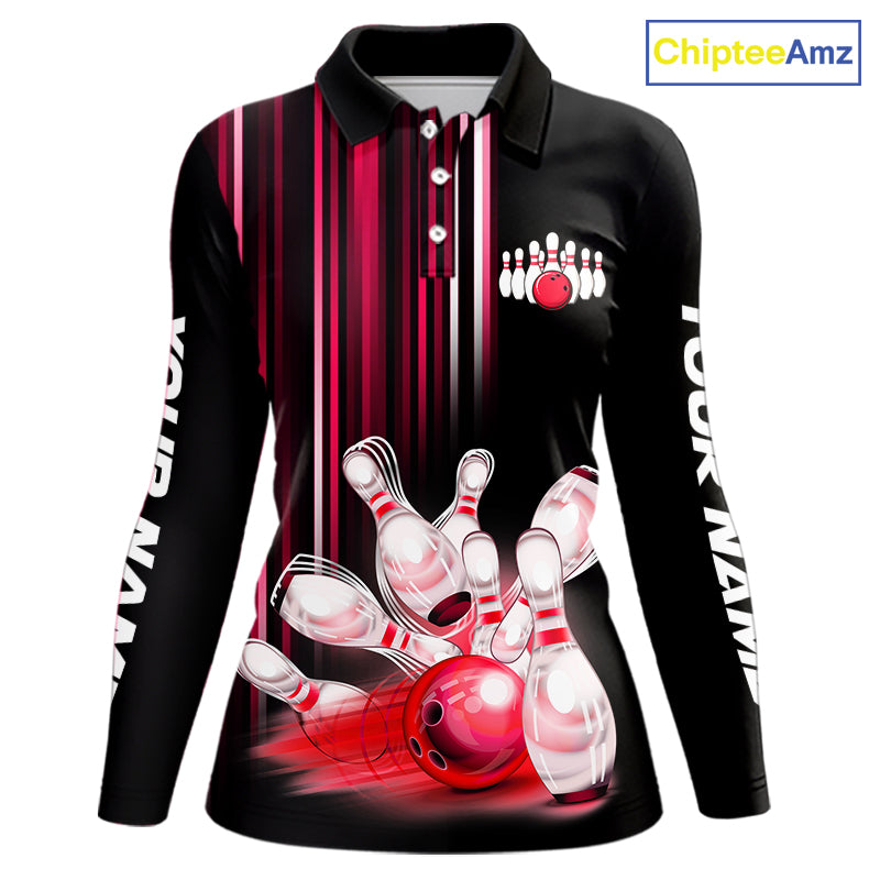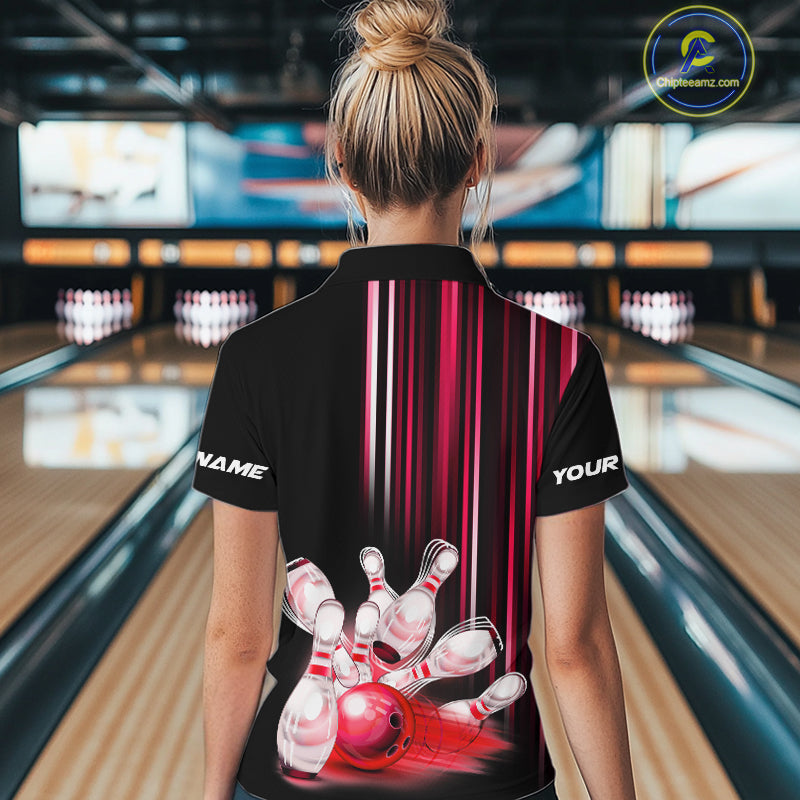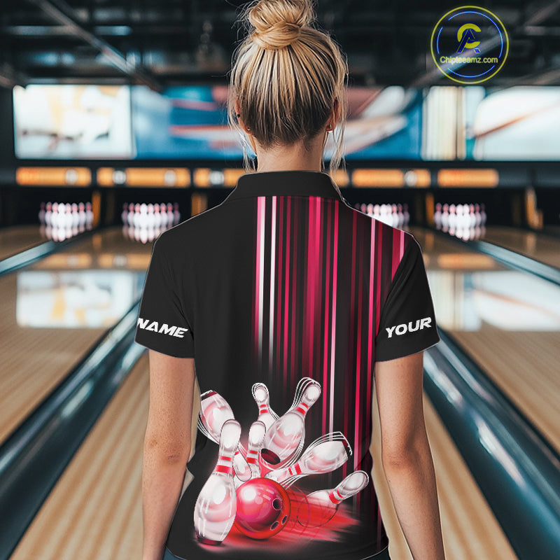 Black and red light Women bowling Polo, Quarter Zip Shirt Custom bowling ball and pins Team jerseys NQS9828