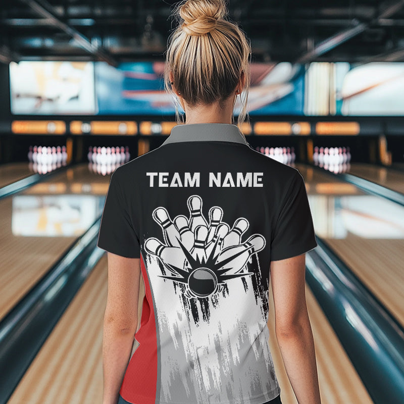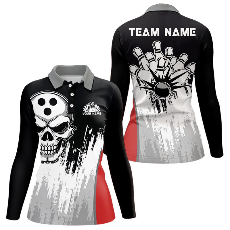 Black and White Skull Bowling Polo, Quarter Zip Shirts For Women Custom Bowling Team Jerseys | Red NQS9587