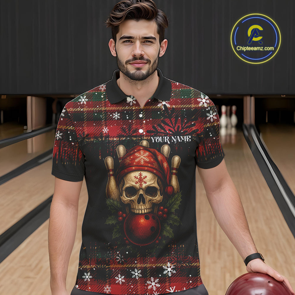 Black & Red Plaid Christmas pattern Skull Bowling Shirts For Men Custom Team Bowling outfit jerseys NQS11057