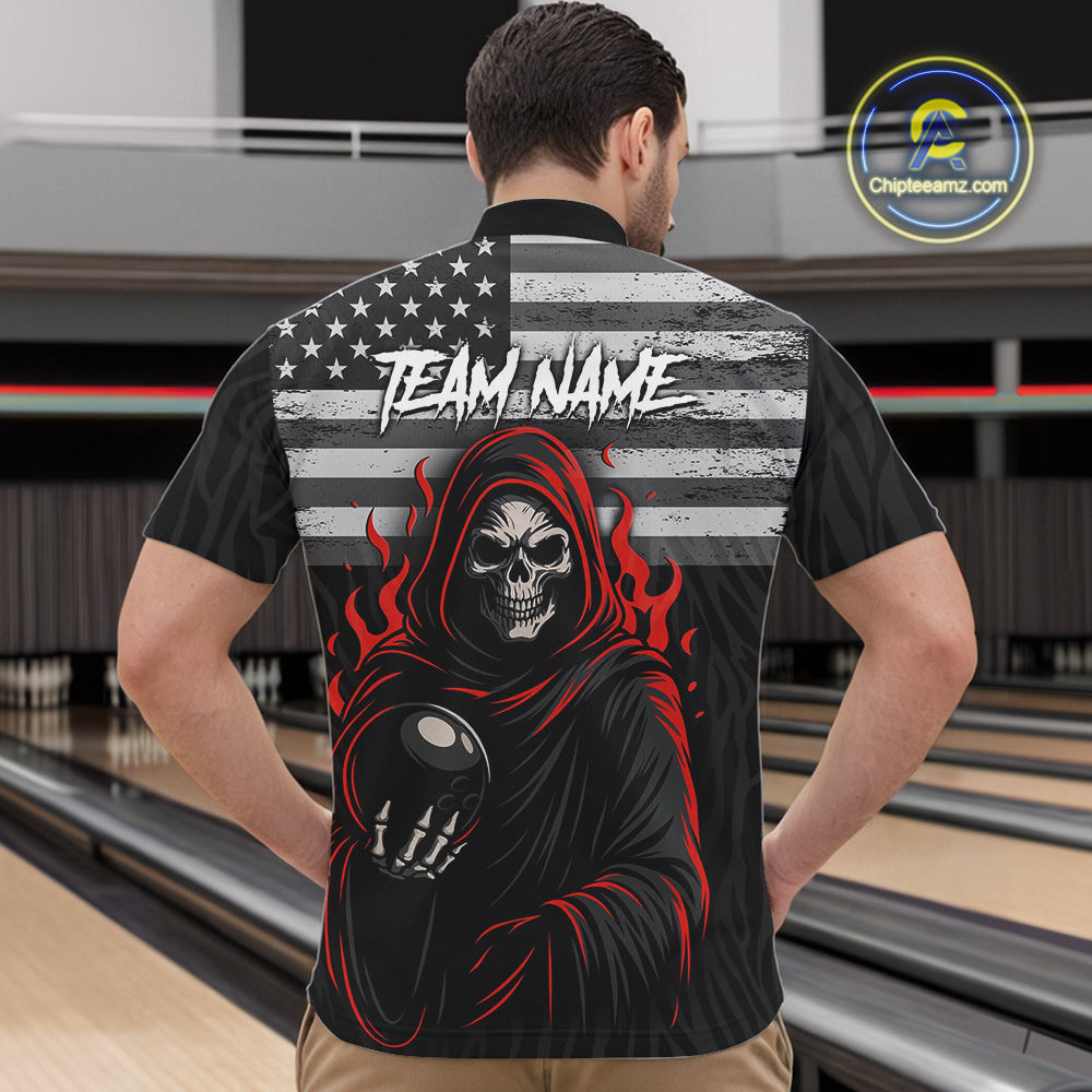 Black & White Camo American Flag Red Flame Skull Reaper Mens Bowling Shirt Custom Team Bowling Jersey NQS10852
