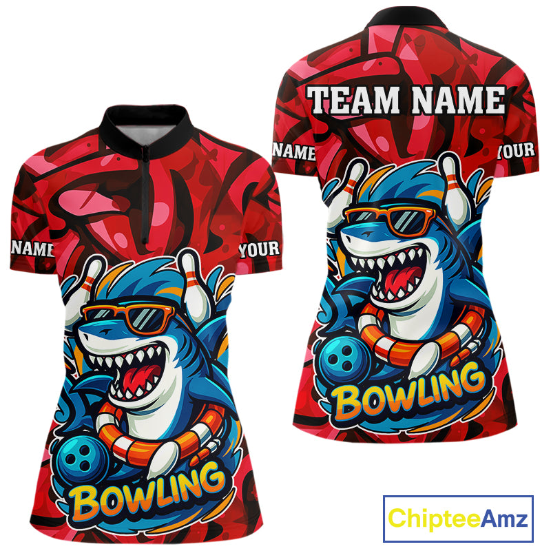 Funny Red Camo Shark Women Bowling Polo, Quarter Zip Shirts Custom Team Shark Bowling Outfit Jersey NQS10076