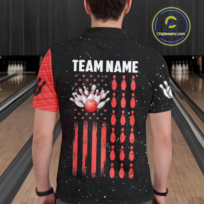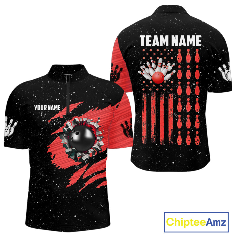 Custom Red Grunge American Flag Bowling Shirt For Men, Patriotic Bowling Team Jersey Polo, 1/4 Zip TDM4633