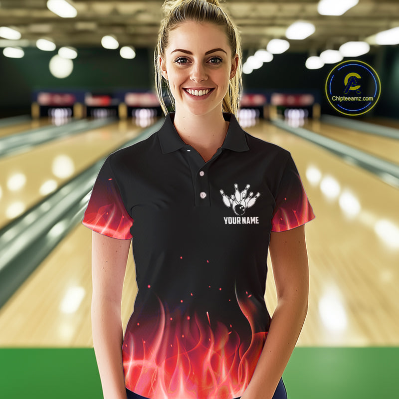 Personalized Women Bowling Shirt Red flame Bowling Ball Pins Team bowling jerseys for ladies Bowler NQS10473