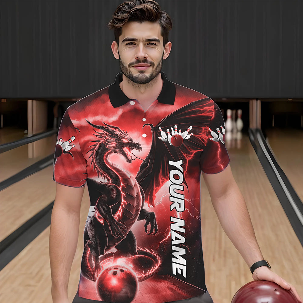 Custom Red Thunder Lightning Dragon Bowling Polo Shirts For Men, Dragon Bowling Uniform IPHW8303