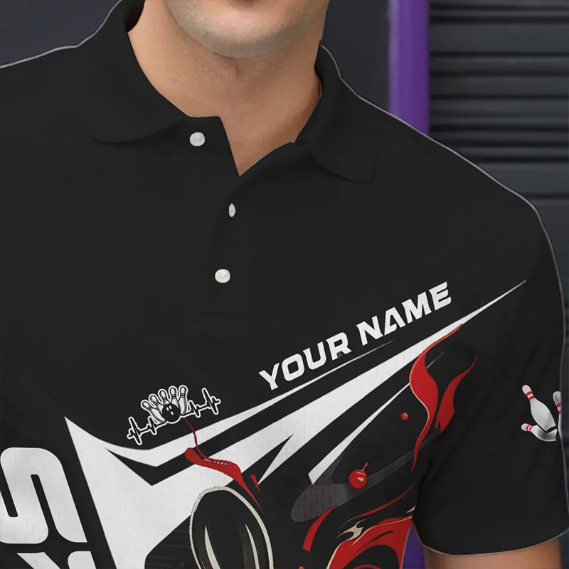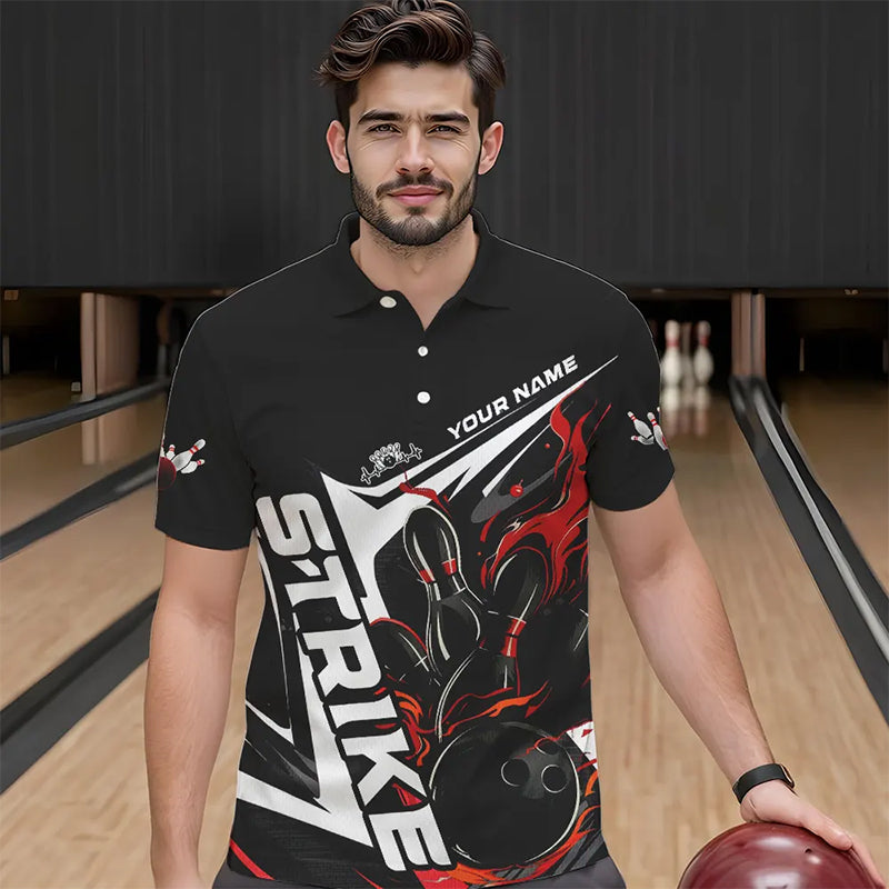 Custom Black And Red Flame Strike Bowling Polo Shirts For Men, Strike Bowling Jerseys IPHW8312