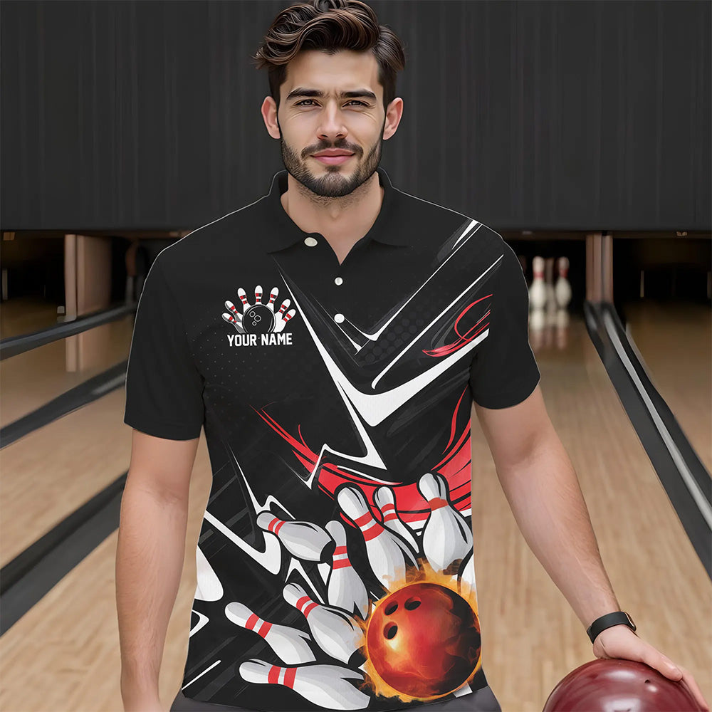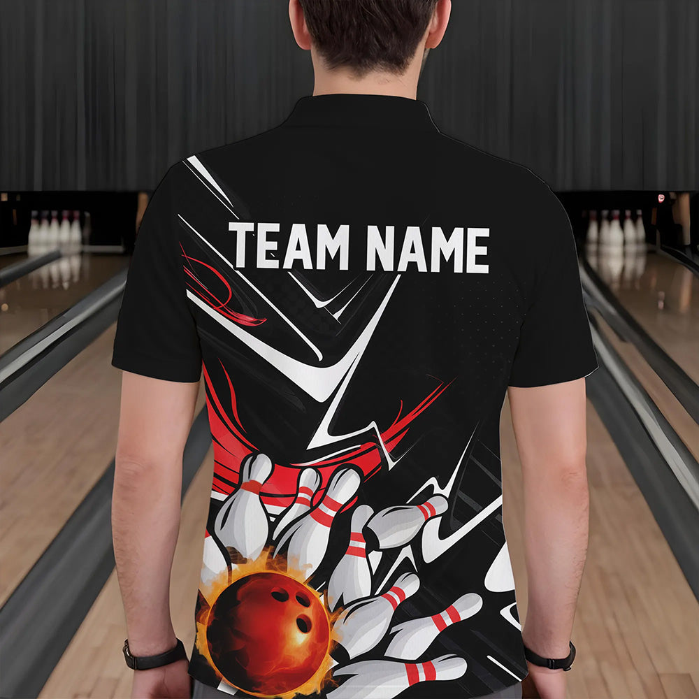 Custom Black And Red Flame Bowling Polo Shirts For Men, Fire Bowling Team Uniform IPHW8316