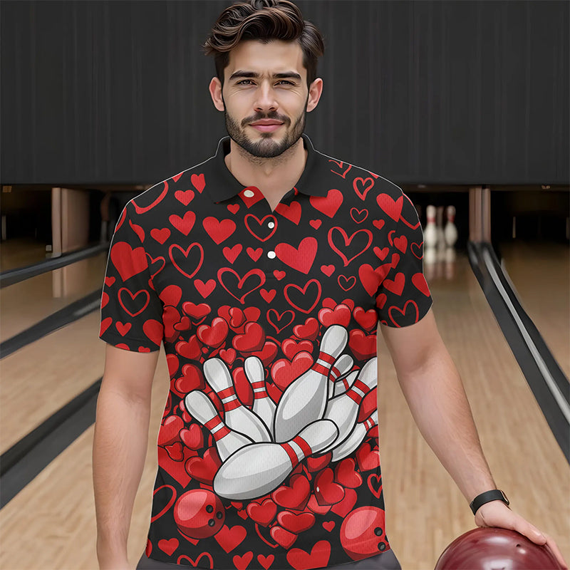 Black And Red Heart Theme Custom Valentines Bowling Polo Shirt For Men, Couple Bowling Shirt IPHW8336