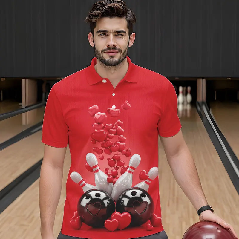 Custom Valentine Day Bowling Red Polo Shirts For Men, Romance Bowling Couple Outfits IPHW8352