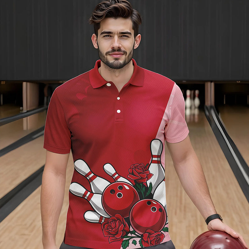 Bowling And Red Roses Custom Valentine Bowling Polo Shirts For Men Bowling Couple Outfits IPHW8354