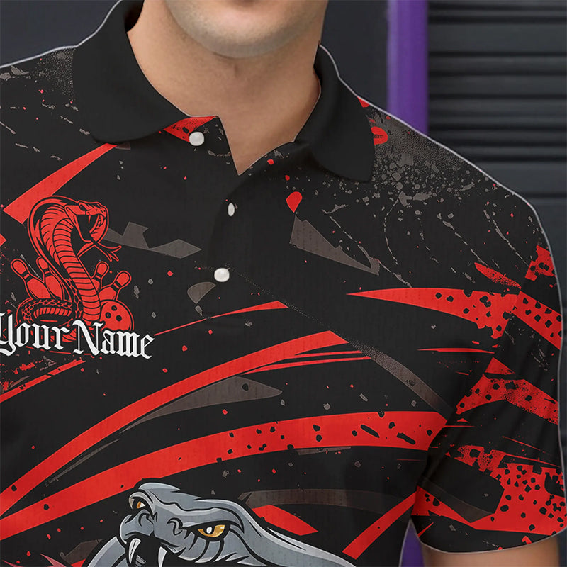Custom Black And Red Cobra Snake Bowling Team Polo Shirts For Men, Bowling League Shirts IPHW8565