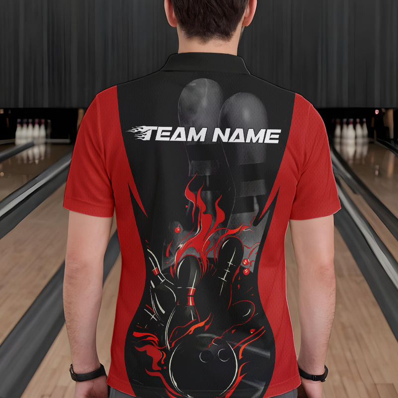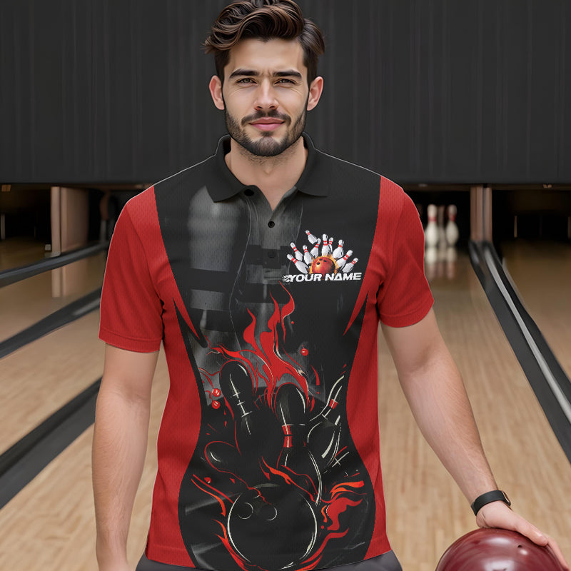 Custom Black And Red Flame Bowling Polo Shirts For Men, Fire Bowling League Shirt IPHW8619