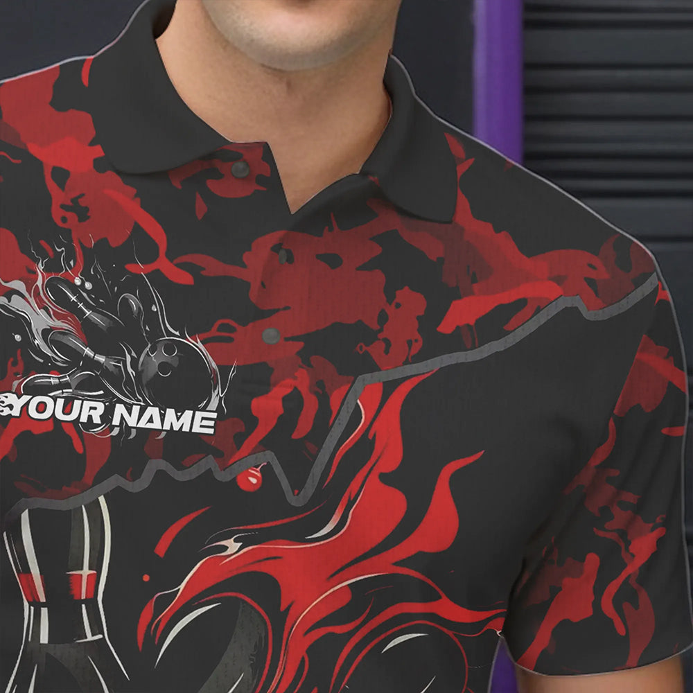 Custom Black And Red Camo Flame Bowling Team Polo Shirts For Men, Bowling Tournament Shirt IPHW8622