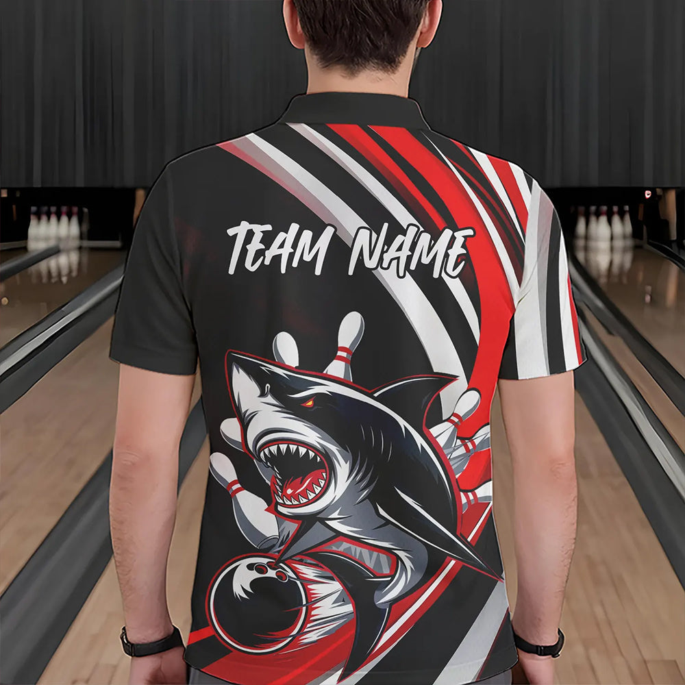 Custom Black And Red Shark Bowling Polo Shirts For Men, Shark Bowling Team Jerseys IPHW8722