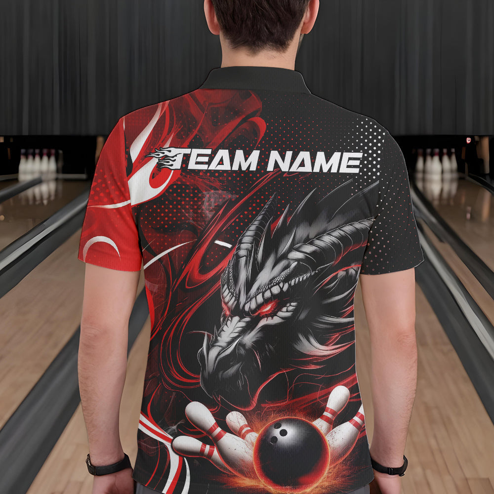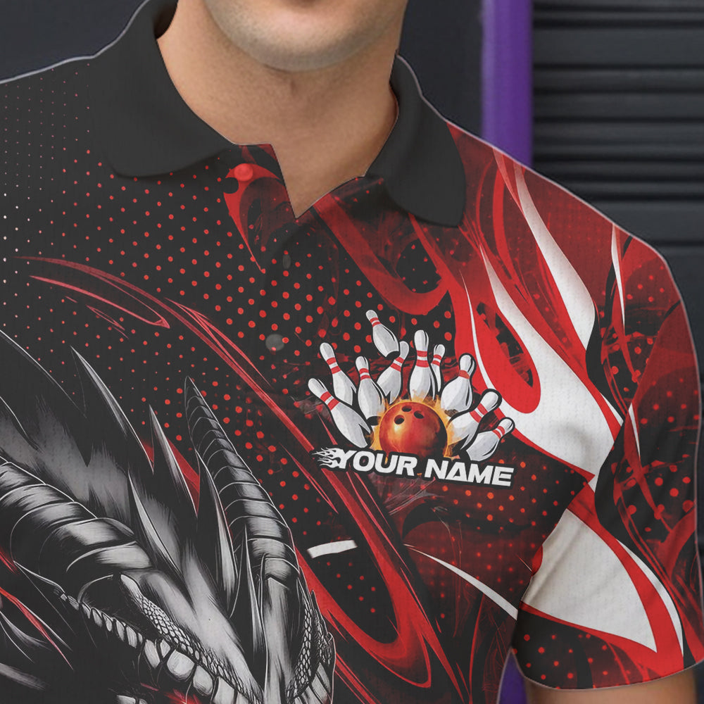 Custom Black And Red Flame Dragon Bowling Jerseys, Dragon Bowling Team Men Polo Shirts IPHW8919