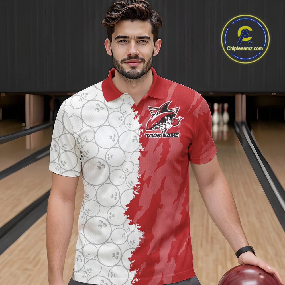Custom White And Red Shark Bowling Polo Shirts For Men, Shark Bowling League Shirt IPHW8994