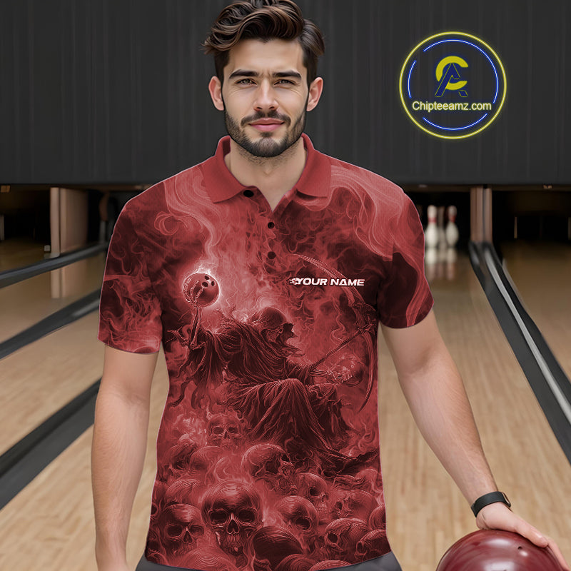 Custom Red Flame Skull Bowling Polo Shirts, Red Smoke Bowling Hallween Outfit IPHW9472