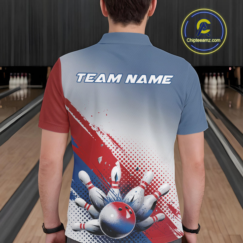 Custom Red, White And Blue Patriotic Bowling Polo Shirts For Men, Bowling League Shirt IPHW9544