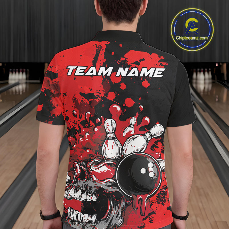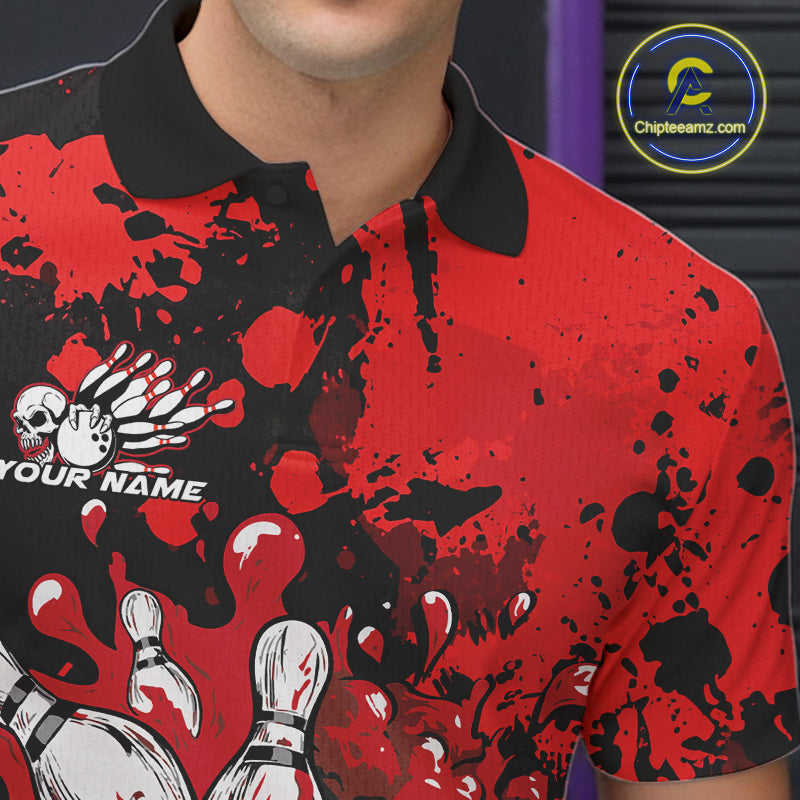 Custom Black And Red Splatter Skull Bowling Team Men Polo Shirt, Halloween Bowler Outfit IPHW9725