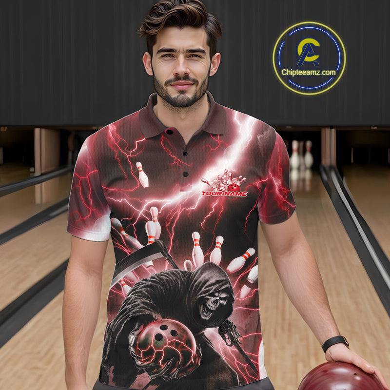 Custom Red Thunder Lightning Grim Reaper Bowling Men Polo Shirt, Halloween Bowling Outfit IPHW9798
