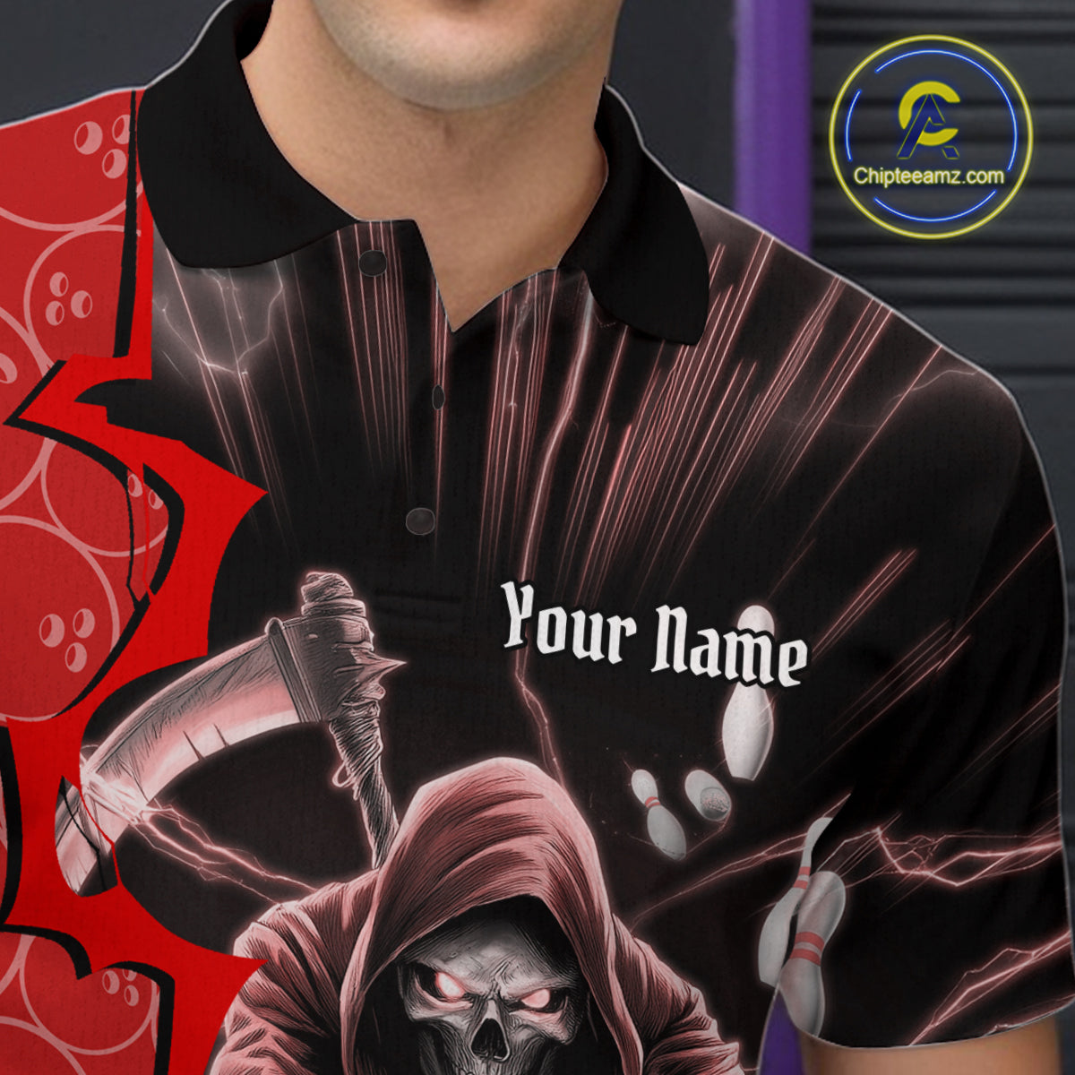 Custom Red Thunder Lightning Grim Reaper Bowling Men Polo Shirt, Halloween Bowler Outfit IPHW9840