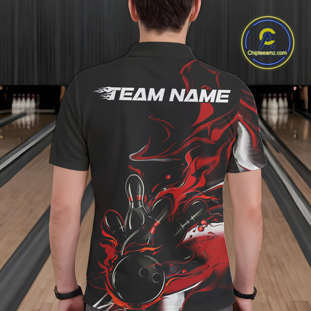 Custom Black And Red Camo Flame Bowling Team Polo Shirts For Men, Bowling Jerseys IPHW9877