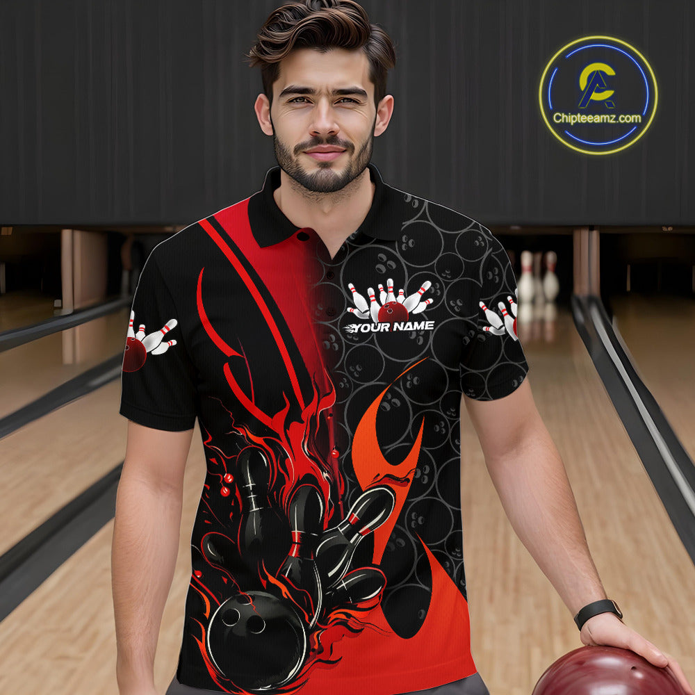 Custom Red Flame Bowling Pattern Bowling Men Polo Shirt, Bowling Team League Shirt IPHW9881
