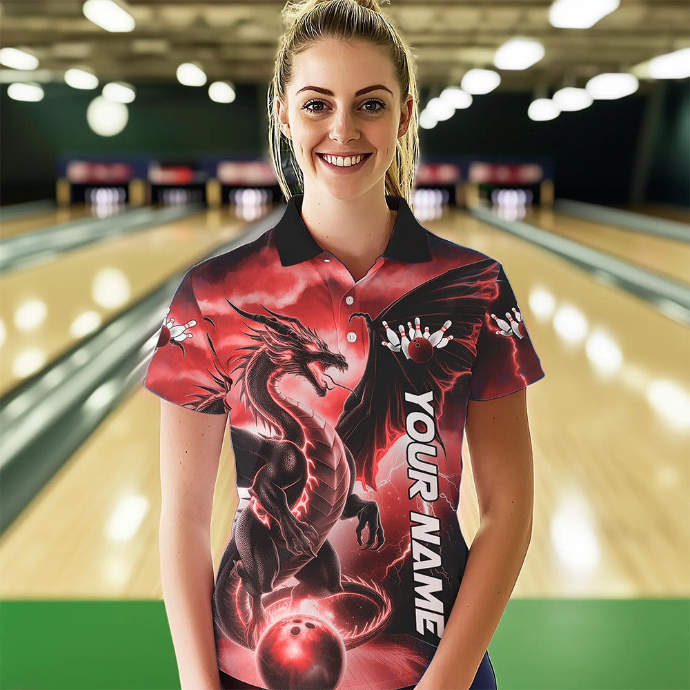 Custom Red Thunder Lightning Dragon Bowling Polo Shirts For Women, Dragon Bowling Uniform IPHW8303
