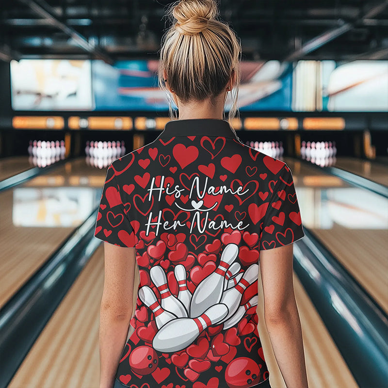 Black And Red Heart Custom Valentines Bowling Polo Shirt For Women, Couple Bowling Shirt IPHW8336