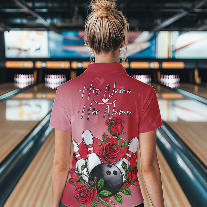 Custom Valentine Bowling Polo Shirts For Women, Bowling And Red Roses Couple Bowling Outfit IPHW8350